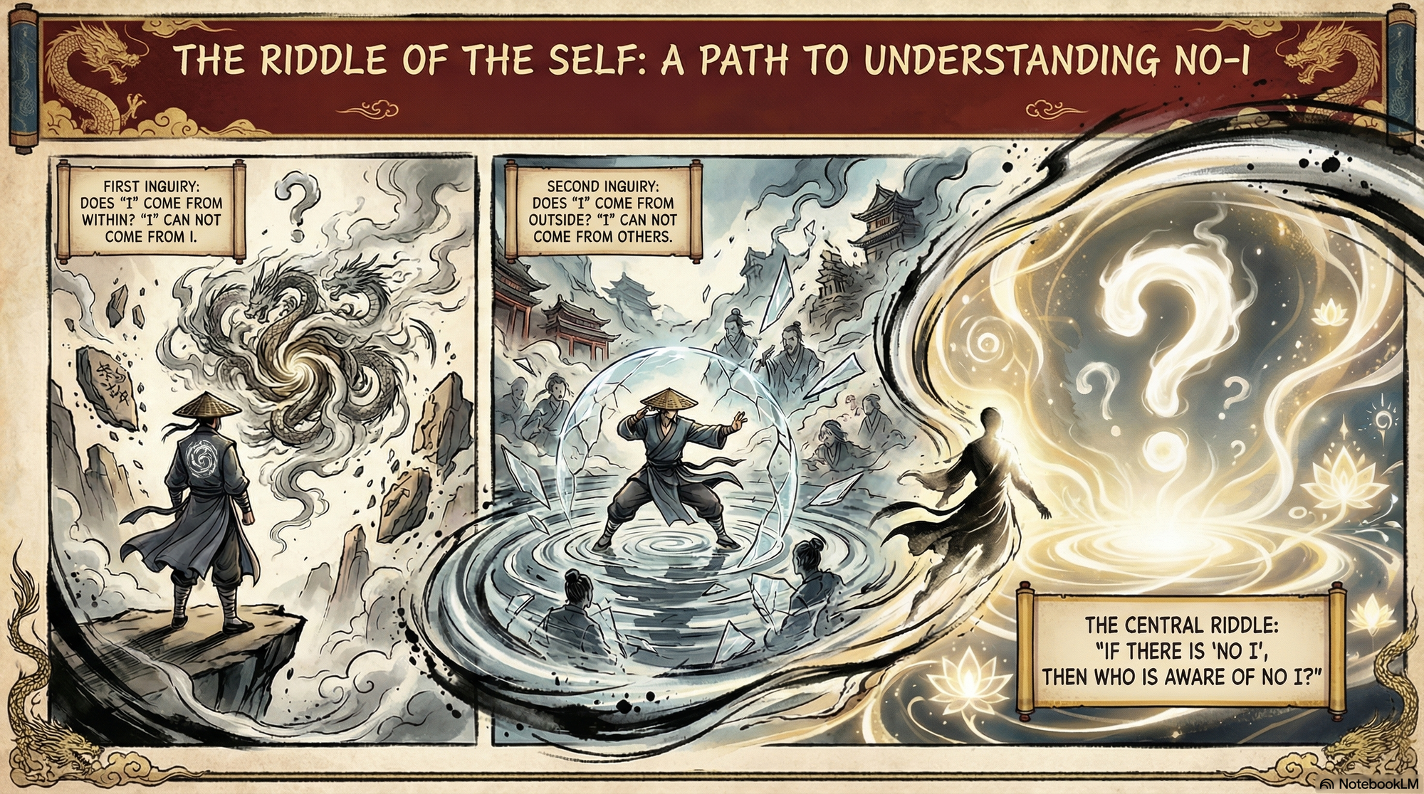 By Timothy in Uncategorized — 11 Feb 2024 Riddle of No-I Photo by Al Soot / Unsplash “ I “can not come from I.“ I “can not come from others.If there is “ No I ”, then who is aware of No I?If “ I “ am aware of no I, where does I come from?Incredible Dharma Middle Way